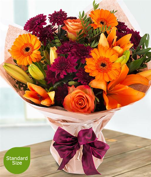 A sumptuous autumnal bouquet inspired by the colours of the season. Deep burgundy's and Atomic oranges create this warming display.