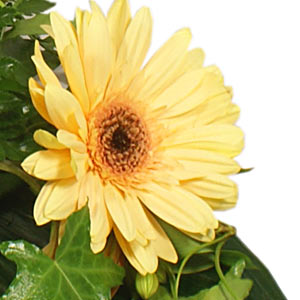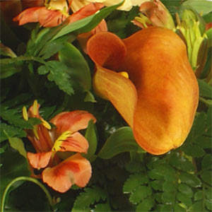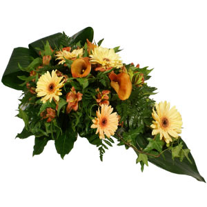 Beautiful autumnal colours mean this luxurious single-ended spray really stands out, with stunning calla lilies, large gerberas and delicate alstroemeria in shades of cream, peach and burnt orange against a backdrop of aspidistra, ivy and leather leaf foliage.