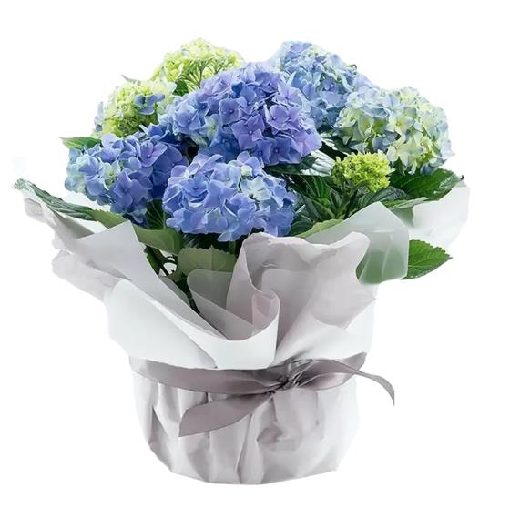 A classic cool blue Hydrangea plant in a presentation gift bag.