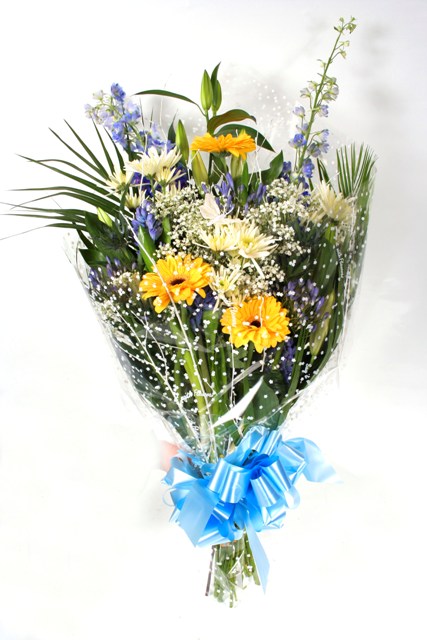 A presentation bouquet with a mixture of lilies, chrysanthemums, gerberas and fillers to compliment.