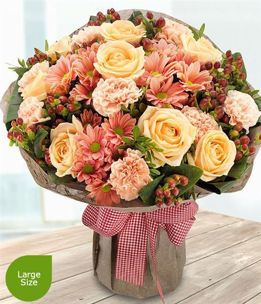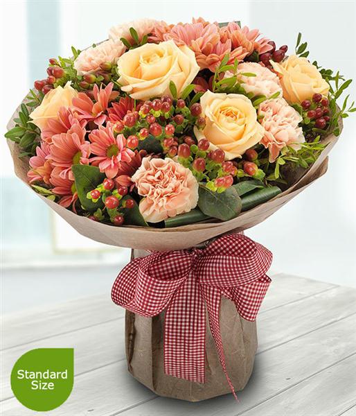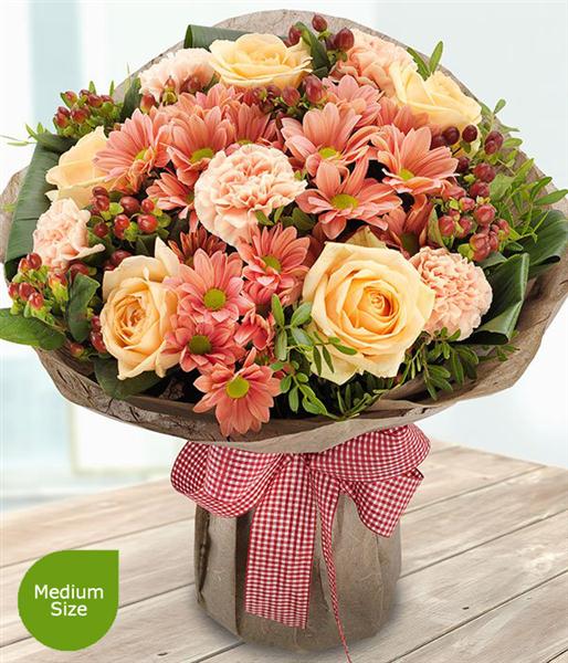 An incredibly attractive caramel coloured aqua pack bouquet. Pretty peach Roses, Spray Chrysanthemums and Carnations with a generous helping of red Hypericum Berries.