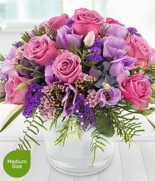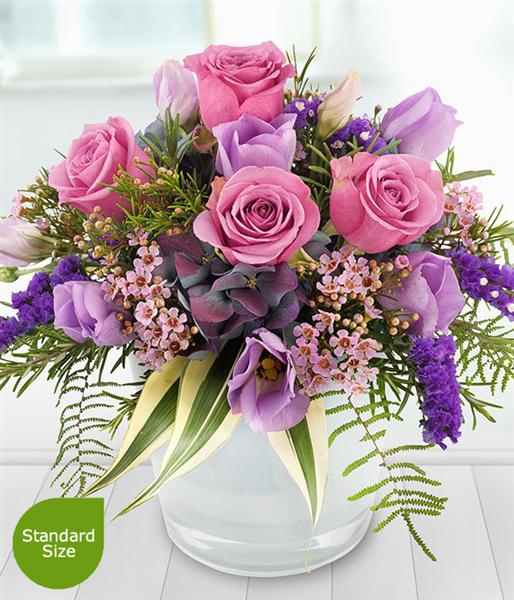 Includes Blue Hydrangea, Pink Rose, Lilac Lisianthus, Purple Statice, Pink Wax Flower, Rosemary, Variegated Sandriana, Fern.