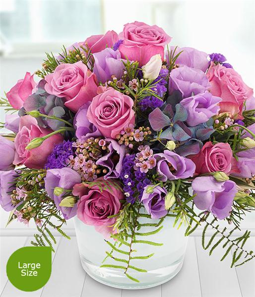 An incredible mix of beautiful blue Hydrangeas, pretty pink Roses & Wax Flowers, lilac Lisianthus, purple Statice and just a dash of Rosemary, expertly arranged in a pretty pot.