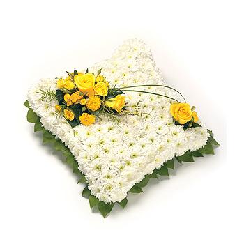 A classically made white cushion with a tasteful header, finished in white, with a choice of ribbon or green edge.