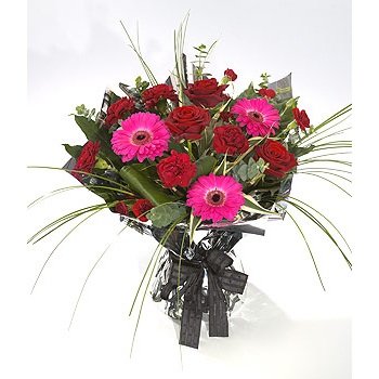 An elegant arrangement featuring Velvet Red Roses, Carnations and Striking Pink Gerbera's; Complimented with Luxury seasonal greenery.