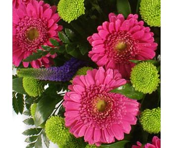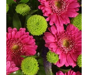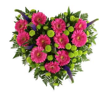 This loosely arranged heart-shaped cushion is one of our best-selling tributes, featuring gerberas and kermit chrysanthemums with a selection of seasonal flowers and foliage. Available in a choice of pink, yellow or white with contrasting lime green and purple. Approximate sizes 12" 15" 18" and 21"