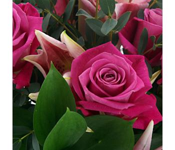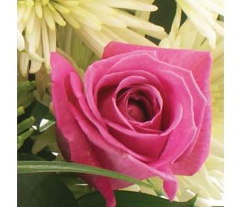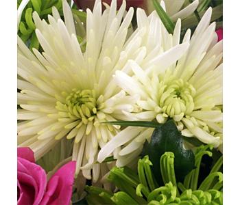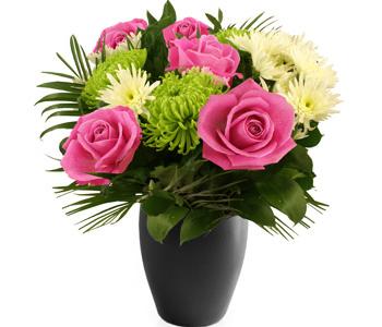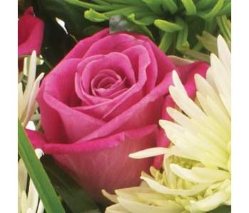 Our Cotton Candy bouquet features shamrock blooms, pretty pink roses, chrysanthemums and palm leaves. Just perfect!