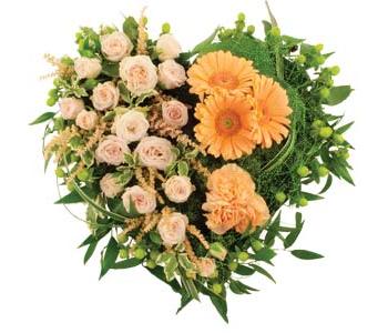 This loosely arranged heart shaped cushion includes spray roses, gerberas and carnations with lush foliage and hypericum.