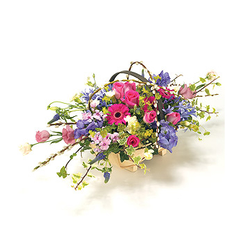 A country style Trug basket arrangement with a mix of flowers in delicate shades of pink, purple & blue, including Roses, Aconitum, Veronica and Phlox. Size: Height - 28cm (11") Length - 40cm (16").