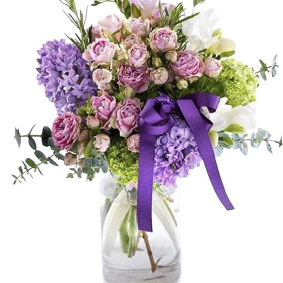 An exquisite pastel vase arrangement featuring Pink Spray Rose, Blue Hyacinths and Scented Freesia; complimented with luxury seasonal greenery.