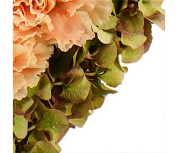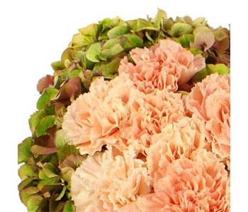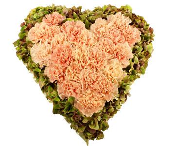 An unusual designer tribute, this beautiful heart-shaped closed wreath is created from a mass of peach carnations surrounded by beautiful hydrangea. The fresh green coloured hydrangea blooms perfectly frame the bed of carnations - all lovingly put together and hand-delivered.