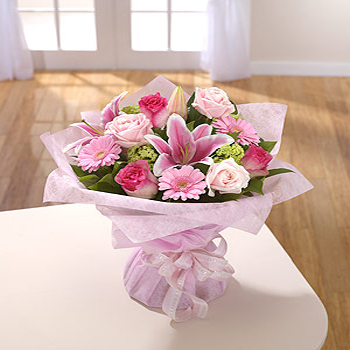 Pretty in pink Layla display featuring Lilies, Roses and Gerbera daisy.