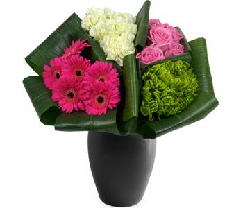 A simple yet stunning bouquet created using grouped flower varieties featuring Vibrant Cerise Gerbera, Pink Roses, Zesty Green blooms, Lime Carnations and collared between Aspidistra and Aralia leaves.