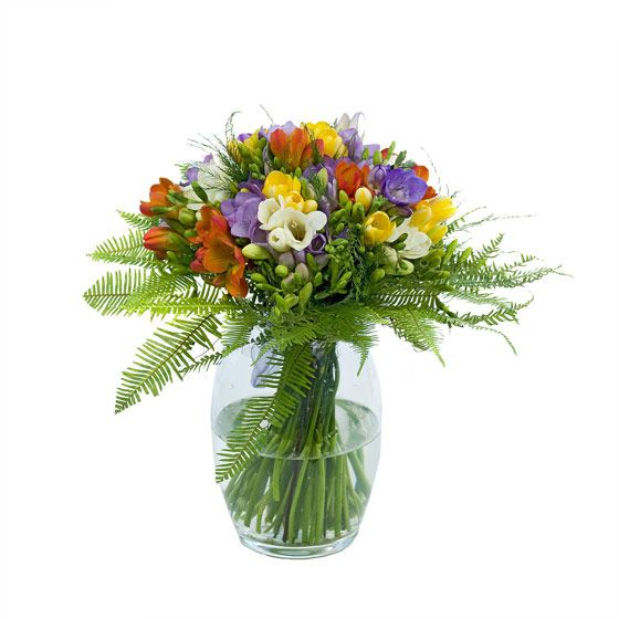 A compact handtied bouquet of mixed freesia and foliages. Simple and elegant.