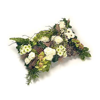 A stunning textured pillow design in shades of green & white, featuring Roses, exotic Orchids, Chrysanthemums, Hydrangea and complementary foliage. Size: Height - 33cm (13") Length - 51cm (20").