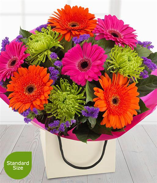 A bright flower gift box arrangement. Cerise and orange Gerberas are complimented by purple's and striking Lime greens.