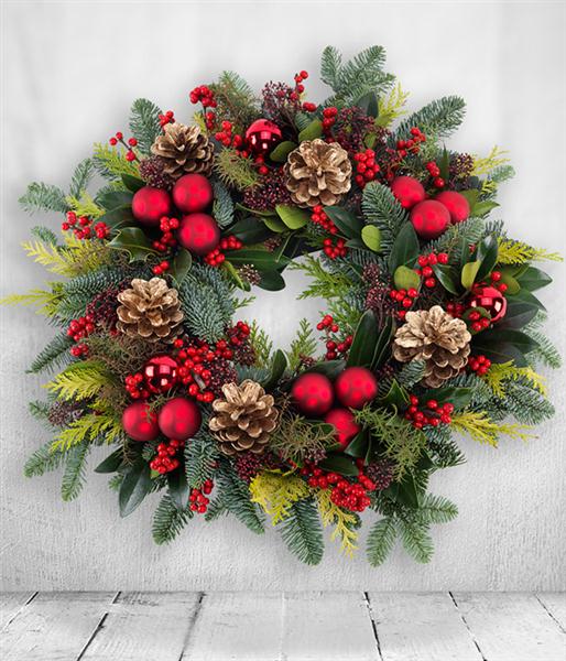 The perfect welcome home this Christmas. This luxury extra large, ruby red, festive wreath is created with scented seasonal foliages and Handmade by our expert florists.