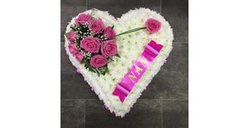 Pink massed heart made with white Bonita spray chrysanthemum, with a pink pleated ribbon edge, completed with a corsage consisting of mixed roses and gypophilia..