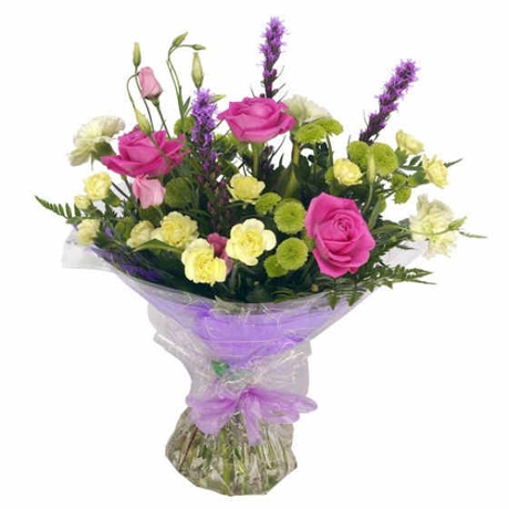 A delightful hand-tied bouquet with pink Roses, cream Carnations, Chrysanthemums, Liatris and Lisianthus and contrasting foliage. Presented in an aquapack for instant display and finished with complementary packaging.