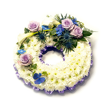 Based white Chrysanthemum open round wreath including Lilac Roses, calla Lily, Hydrangea and Eryngium with complementary foliage. Size: Diameter - 14”