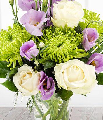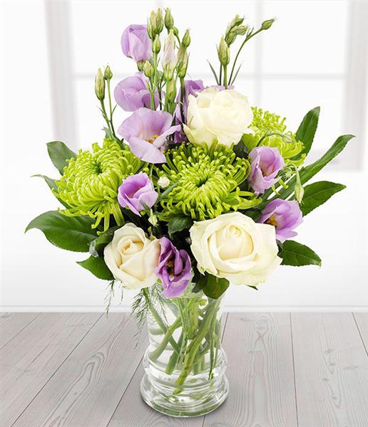 Lovely lilac Lisianthus blooms with glorious green Chrysanthemums and creamy white Roses. Professionally arranged in a clear glass vase and ready to display.