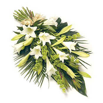A classic and natural sheaf of Longiflorum Lilies, 'Bells of Ireland' and complementary foliage tied with a natural raffia bow. Size: 64cm (25").