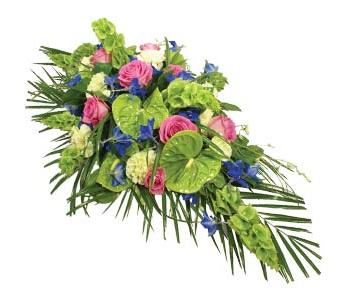 A contemporary fresh flower casket spray in shades of lime green, pink, and royal blue.