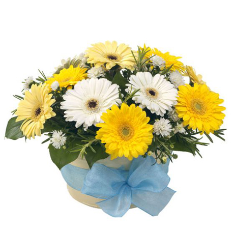 This delightful modern arrangement of complementary shades of yellow Gerbera, Germini, Montbretia and foliage is presented in a lovely container with organza bow detail.