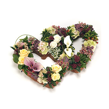 A stunning double heart shaped tribute in subtle colour scheme of pink, peach, bronze and lemon, including Lilies, Hydrangea, Roses and flowering foliage.