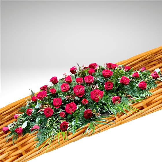 A stunning casket spray of gorgeous red roses, arranged beautifully with matching filler and complimentary seasonal foliage.