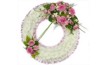 A stunning round wreath with ribbon edge, covered in white spray chrysanthemums, and then finished with roses, and various other suited flowers in a colour of your choice. (picture shows large option)