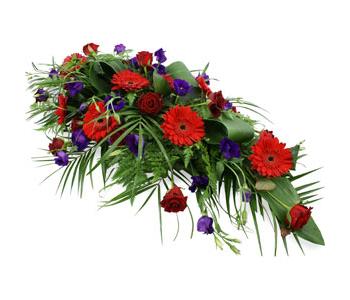 This lovely casket spray is made using luxurious red roses, red gerbera and complimented with vibrant purples and luxurious seasonal greenery.
