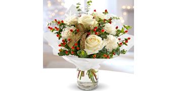 White Roses and Carnations have been beautifully complimented with red Hypericum berries in this simply divine Christmas flower display.
