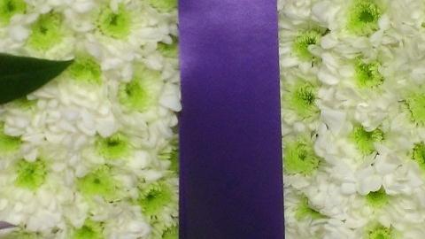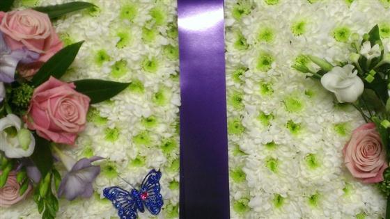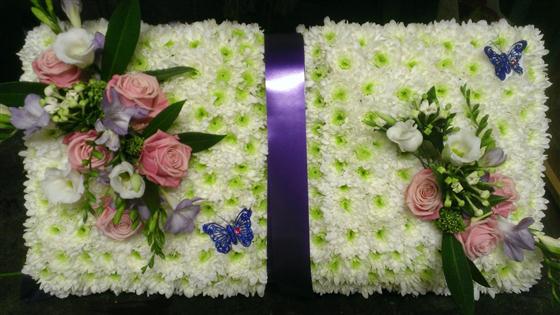 A bed of white double spray chrysanthemum's trimmed with ribbon is the basis for this classic open-book floral tribute. The display is finished with a corsage's in a choice of your coulor scheme.