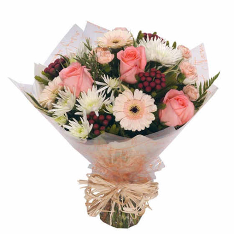 A charming hand-tied bouquet of peach and cream flowers including Roses, Mini Gerbera, Carnations and Chrysanthemums complemented by rich green foliage and complementary packaging. The bouquet is supplied in an aquapack for instant display.