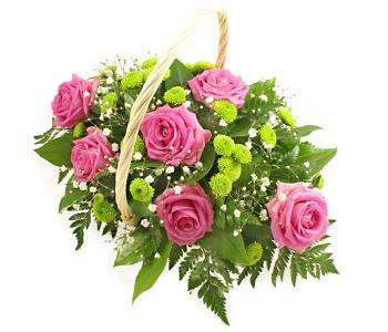 A stunning and contemporary collection of luxurious pink roses and lime green chrysanthemum blooms, with gypsophila and fern foliage. This flower basket arrangement is delivered by hand in a pretty wicker basket, it is the perfect gift for any occasion or celebration.
