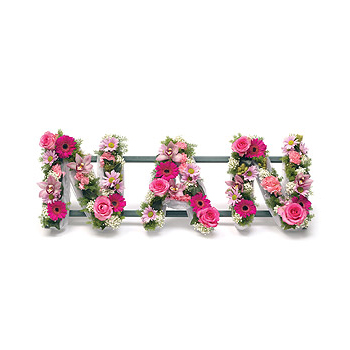 Loose based letters on stand, including exotic Orchids, Roses, Gerberas, Chrysanthemums and complementary ribbon edging. Size: Height - 28cm (11") Length - 80cm (31").