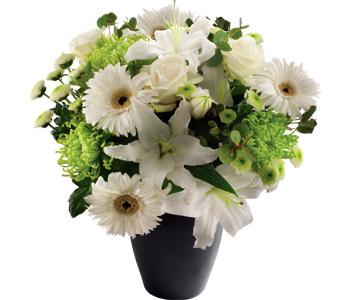 Oriental lilies, white roses, mini gerberas and shamrock blooms are joined by a selection of seasonal foliage. A beautiful, classy collection of timeless blooms which, while subtle in colour, still provide for a striking display which is suitable for a host of special occasions.