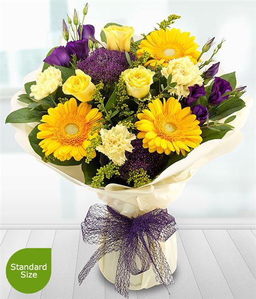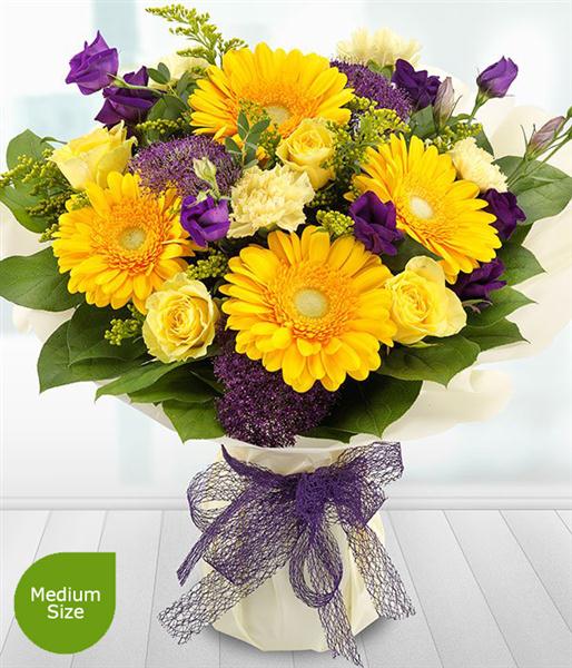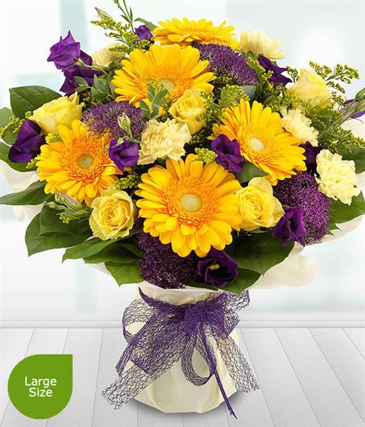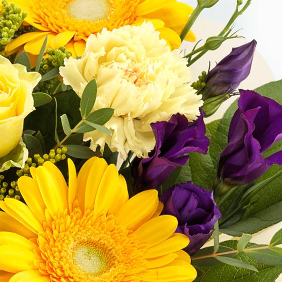 Yellow Roses, Yellow Gerberas, Purple Lisianthus, Purple Trachelium, Yellow Solidago, Yellow Carnations, Eucalyptus and Salal make up this stylish arrangement.