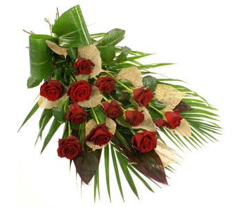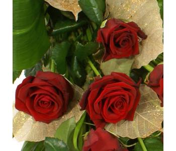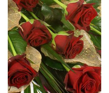 This stunning arrangement of luxurious red roses, displayed on a bed of palm, is finished with gold leaf detailing. Hand tied this striking arrangement is perfect for all occasions, and makes an especially nice romantic gesture.