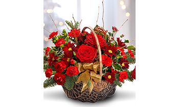 A gorgeous ruby red flower Basket bursting with flourishes of festive reds, burgundy's and gold's.