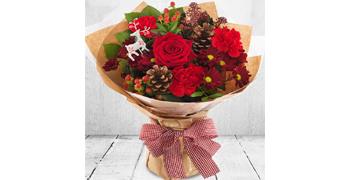 We've got Christmas all wrapped up with this pretty aqua arranged Bouquet. An array of rich red, browns and greens. Chrysanthemums, Carnations and roses surround beautiful pine cones and berries.