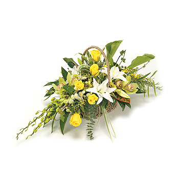A stunning Sea grass Basket arrangement, including exotic Orchids, Lilies, Roses and Chrysanthemums with complementary foliage. Size: Height - 31cm (12") Length - 41cm (16").