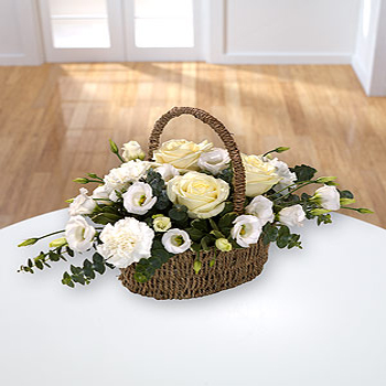 An Oval basket arrangement of white flowers, including Roses and carnations