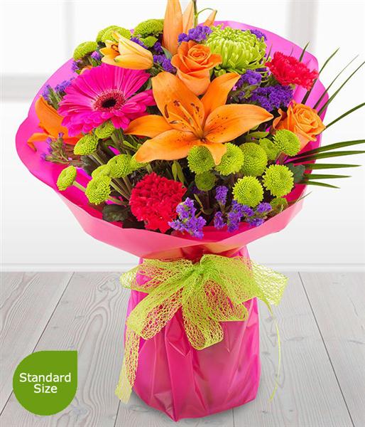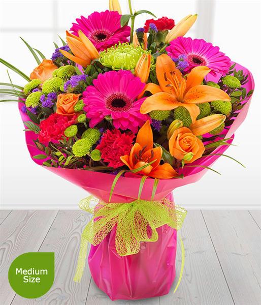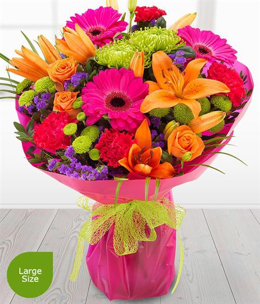 A simply fabulous and incredibly colourful flower combination. Orange Roses & Lilies mixed with cerise Gerberas & Carnations, set amongst glorious green Chrysanthemum blooms.