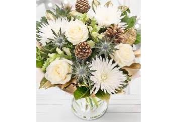 A bouquet that oozes Winter elegance. White roses are beautifully complimented with Crisp blooms, Deep blue Thistle, Pine cones and assorted luxury Christmas foliage.