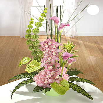 Pink Cymbidium Orchids and Calla Lilies are the heroes of this statement design. Built on a base of frilly pink Carnations and Calathea leaves and accented with green Anthurium.