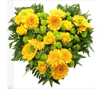 This loosely arranged heart-shaped cushion is one of our best-selling tributes, featuring gerberas and kermit chrysanthemums with a selection of seasonal flowers and foliage. Available in a choice of pink, yellow or white with contrasting lime green and purple. Approximate finished sizes 12" 15" 18" and 21"