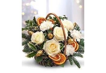 A stunning Christmas flower basket arrangement including dried orange slices, White Roses and Carnations with a touch of seasonal greenery for a scentsational overload!
