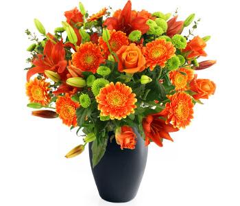 A vibrant array of Zesty Oranges and Lime Greens create the perfect "Tequila Sunrise" Bouquet.